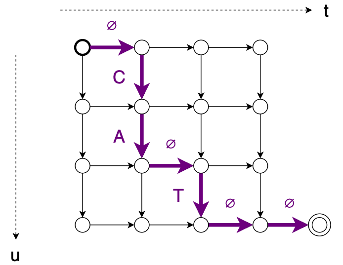 Jointly modelling over both input and output sequence length is what allows the decoupling of the two lengths, and thus the removal of the CTC sequence length restriction. Due to the introduction of a language model, we no longer consider the redundancy in terms of repeated symbols from CTC. This means that for each output sequence, e.g. , we can model each alignment, e.g. , as a path from the top-left to the bottom-right in a grid as seen on image BELOW. [@lugoschSequencetosequenceLearningTransducers2020]