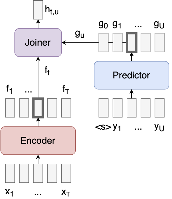 RNNT resolves CTCs problems by slightly modifying and extending its architecture. To deal with the sequence length restriction, RNNTs allow for producing multiple outputs per input. Furthermore, in addition to the CTC encoder, denoted here as the transcription network, , it adds a language model, dubbed the prediction network, , and a simple feed forward network passed into a softmax function, the joiner. All this enables to model to take context into account. [@gravesSpeechRecognitionDeep2013]